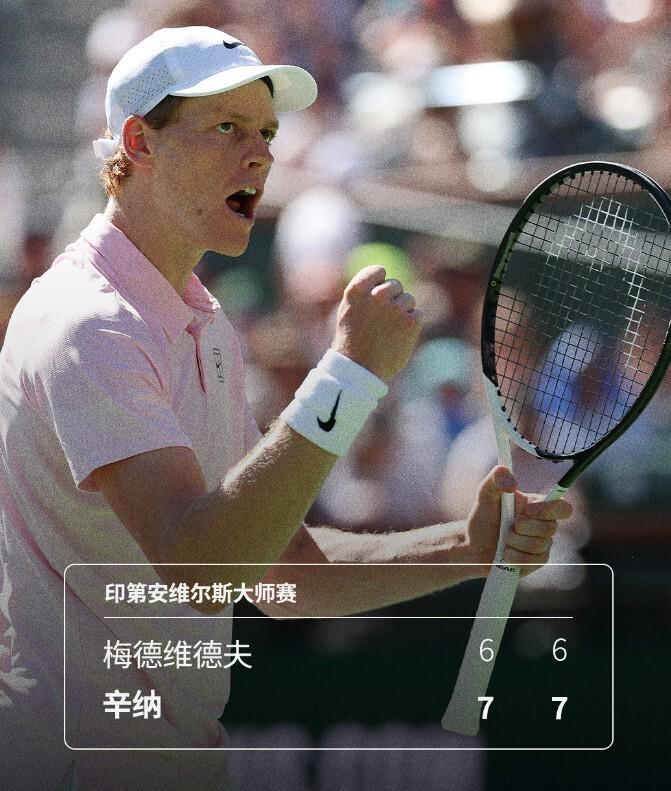 3月16日,ATP1000印第安维尔斯站决赛进行,对阵双方分别是2号种子辛纳和11号种子梅德维德夫。经过了两盘比赛抢七的激战,辛纳2-0险胜梅德维德夫,取得了个人大师赛第100胜,首夺印第安维尔斯大师赛冠军。
